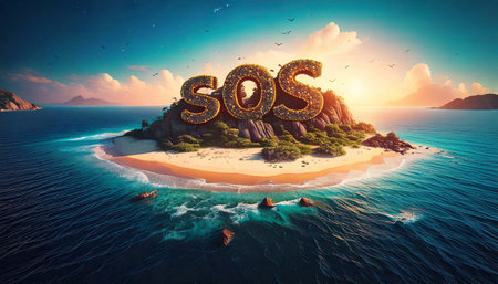 A large SOS sign is prominently displayed on a sandy beach of a deserted island at sunset.
