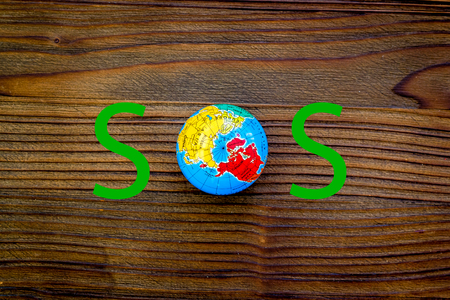 SOS Save the planet concept. The Earth as part word SOS on dark wooden background top view flat lay copy space