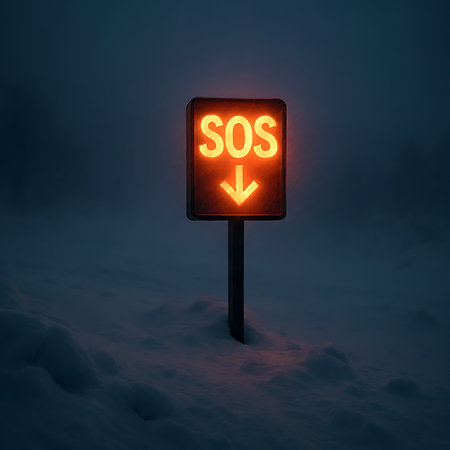 An urgent orange SOS sign with a downward arrow illuminates a cold, dark winter landscape. The glowing signal stands in deep snow, indicating a critical need for help.