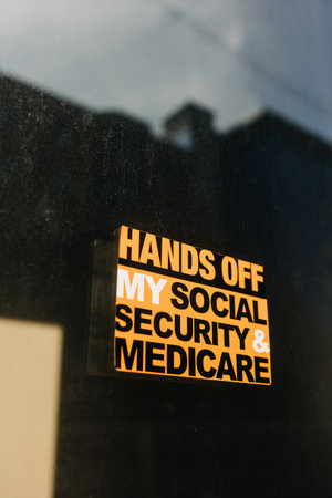 Hands off my social security and medicare sign displayed on a window in a public area during daylight