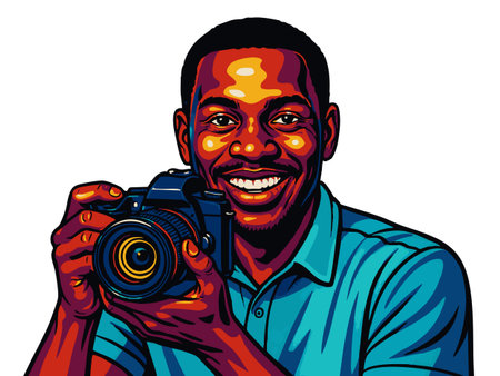 cheerful man aiming a DSLR camera, ideal for photography, content creation, and creative industry themes. Generative ai vector colorful pop art illustration.