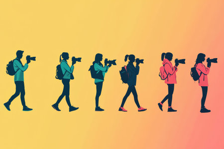 Stylized silhouettes line up, each holding a camera or phone, embodying a vibrant mix of preparation and excitement in a bright setting.