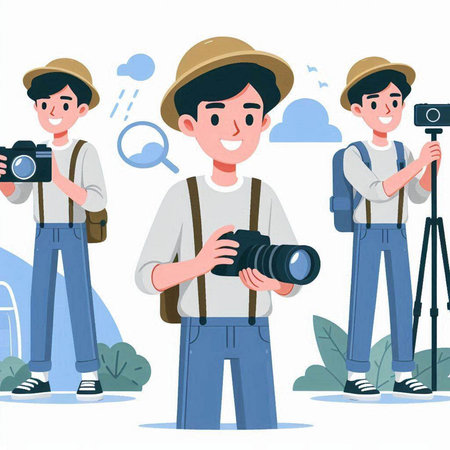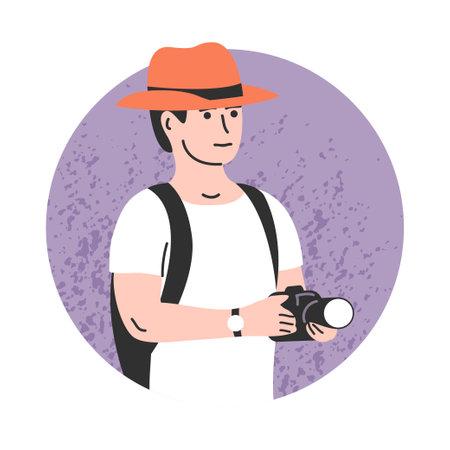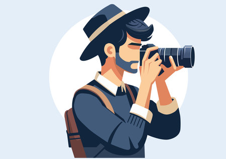 Illustration of a man wearing a wide-brimmed hat and backpack taking photos with a DSLR camera.