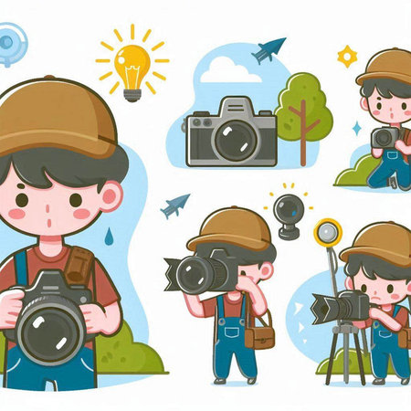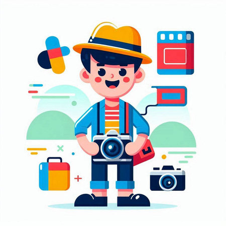 Photographer boy with camera equipment. Vector illustration in flat cartoon style
