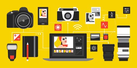 Photography and photo editing concept: camera, laptop and photography equipment connecting together