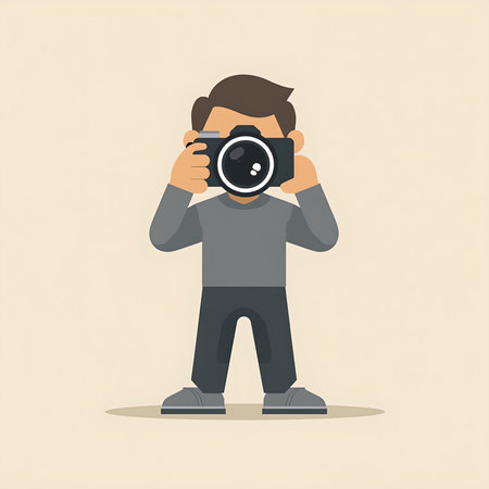 Minimalist photographer icon with camera and lens in muted tones
