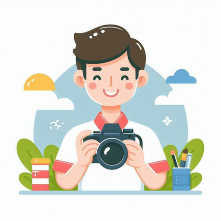 A cartoon man takes a photo amidst floating objects: a football, bag, game controller, and toiletries, set against a light yellow background.