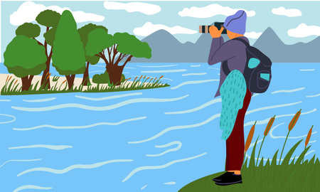 Photographer in nature. Man taking picture with camera. Scenic landscape. Guy shooting photos. Tourist photographing lake water and forest trees. Travel snapshots. Vector illustration