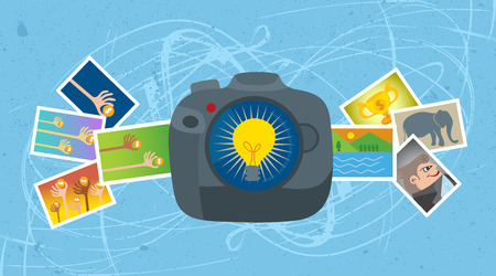 Colorful vector illustration of a camera with different objects on white background