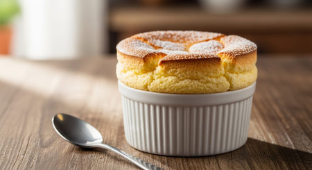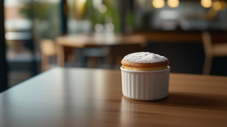 Classic vanilla soufflé dusted with powdered sugar in a white ramekin on a wooden table. French dessert. Restaurant dining