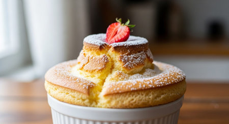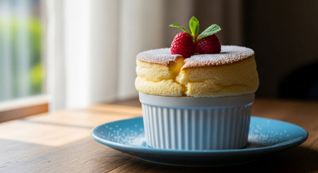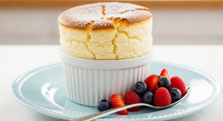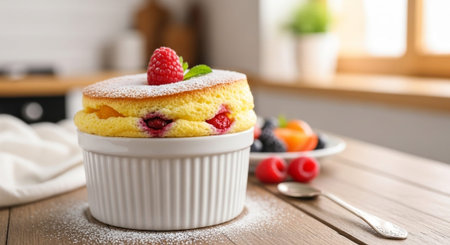 A delightful dessert of egg souffl served in a charming ramekin, topped with powdered sugar and fresh berries for a sweet finish.
