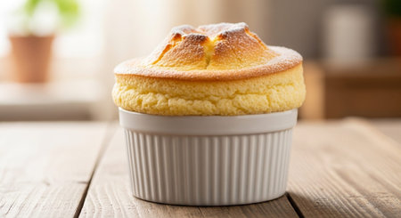 Classic vanilla soufflé dusted with powdered sugar in a white ramekin on a wooden table. French dessert. Restaurant dining