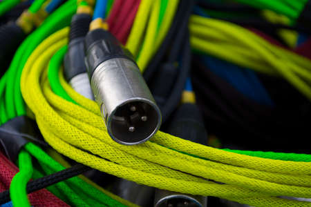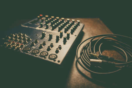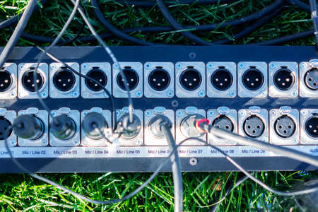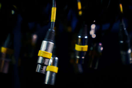 audio jack and wires connected to audio mixer, music dj equipment at concert, festival or party