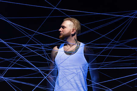 Young mans portrait isolated on blue studio background in multicolored neon light with geometric luminescent shape cirlce