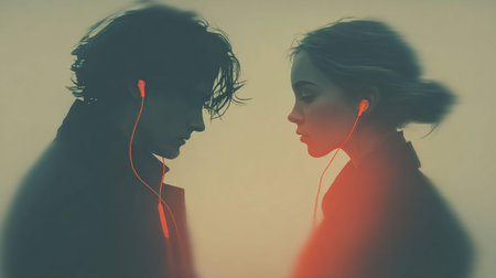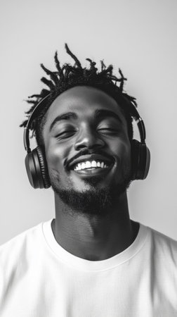Closeup of an Afroamerican man with headphones, minimalist style, monochrome white and black background, modern and fresh