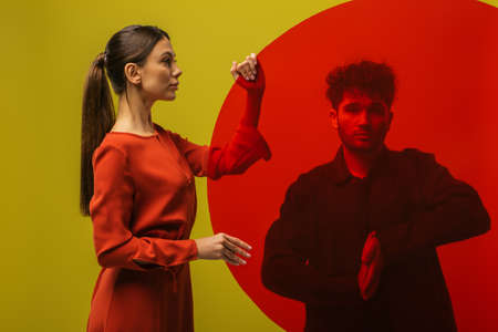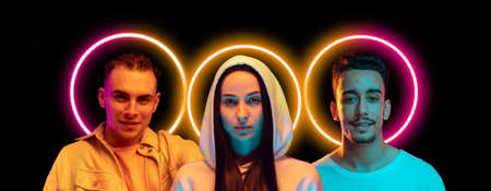 Collage of men and woman dressed youth fashion style standing together isolated on dark studio background in neon light with luminescent shape cirlces