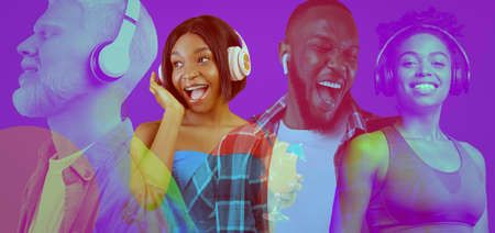 Happy multiracial young people wearing headphones, bright collage, panorama