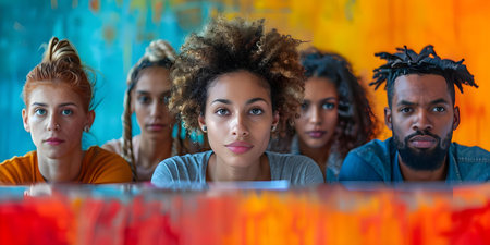 Close up portrait of young people in neon light. Human emotions, facial expression. People, astonished, screaming and crazy in happiness. Creative collage. High quality photo