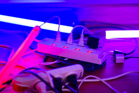Audio and video jack cable connected at rear end of receiver, amplifier or music mixer at concert, party or festival. Soft effect on photo