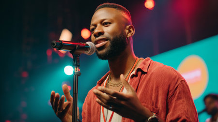 Smiling young man speaking confidently into a microphone on a stage with bright lights, delivering a presentation during a vibrant event with audience interaction.