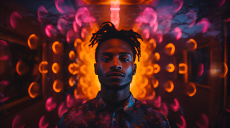 Handsome african american man with dreadlocks hairstyle and colored lights on his face