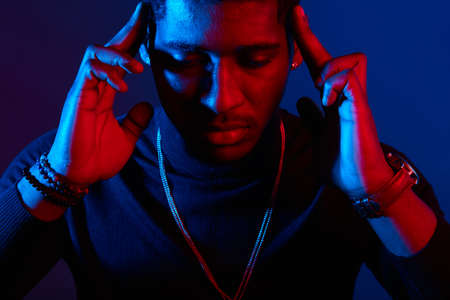Portrait of a young african man at studio. Fashion male model in colorful bright neon lights.