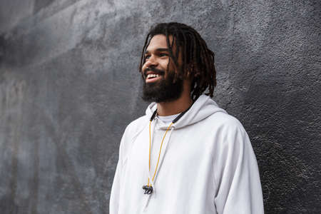 Stylish smile african american man rapper with dreadlocks at violet wall background