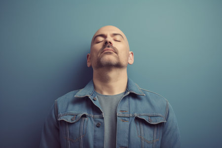 Portrait of a bald man in a denim jacket with closed eyes
