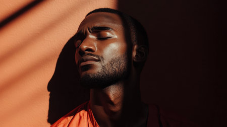 This striking portrait captures a calm man with closed eyes, bathed in warm shadows that evoke feelings of tranquility and introspection in a minimalistic atmosphere.