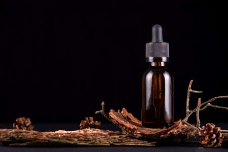 Plain brown glass flask-barrel with a black cover and a glass-dropper which abuts upon, all covered with water drops and is placed on a blacktextured background. Medicine or cosmetics implements concept. Place for text.