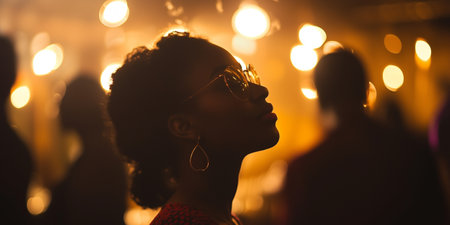 Pensive african female with curly hair in soft lighting.