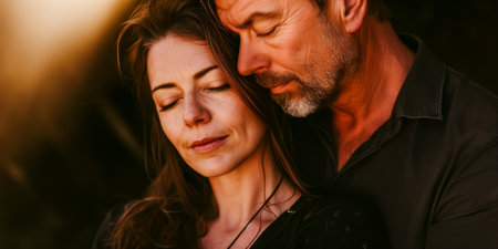 A man and a woman are tenderly embracing each other in a warm and intimate gesture. They are facing each other, their arms wrapped around one another, expressing love and affection.