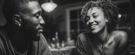 A couple smiling and enjoying each other's company in a warm, intimate atmosphere
