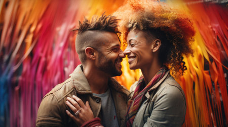 A joyous black man and an Asian woman share smiles and laughter in a warm moment of connection. Their happiness reflects unity in diversity celebrating love and friendship between cultures.