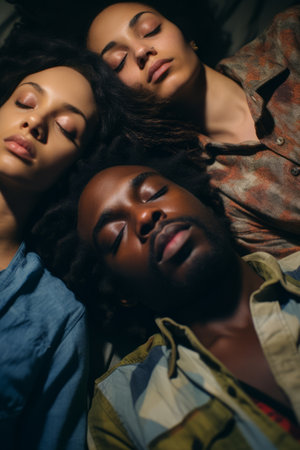 Three young adults in a serene pose, heads resting together, eyes closed, conveying a sense of peace and unity.