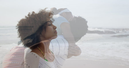 Image of african american parents and daughter playing on beach over woman meditating on beach. Holidays, happiness, family and togetherness concept digitally generated image.