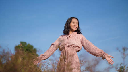 Happy young girl wear dress standing at the field grass.