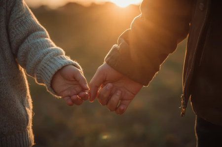 Two hands are gently clasped together during sunset in a peaceful outdoor location. The warm glow of the setting sun enhances the moment, creating a feeling of connection and intimacy.