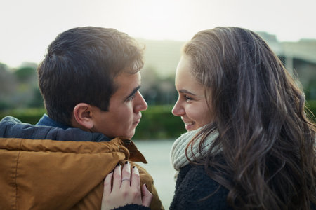 A tender moment between a young couple sharing a loving gaze outdoors by the water