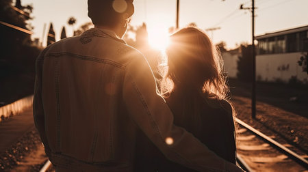 Back view of young couple standing on the railway station platform at sunset