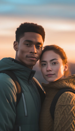 Loving couple embracing in golden sunset light, intimate moment
