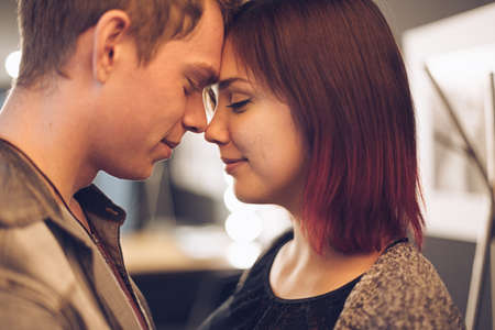 Tenderness moments between two young people, touching with foreheads and noses with happy face expressions while smiling