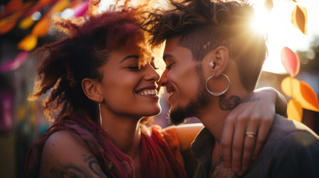 A joyful young couple shares a tender moment, their faces close and smiles bright, conveying warmth and connection.