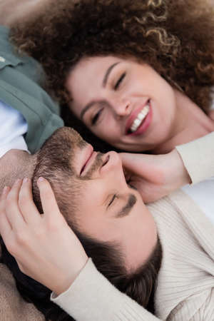 top view of happy blurred woman touching face of blurred man