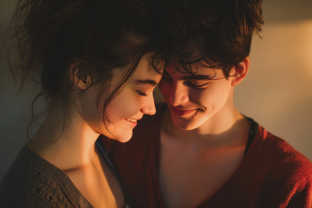A heartwarming scene of two young individuals sharing a tender moment in a natural setting, illuminated by soft sunlight, capturing genuine affection and connection.