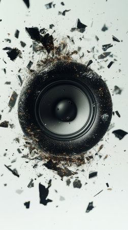 A speaker erupts with force, sending fragments flying in all directions. The powerful sound wave creates an impactful moment, showing the energy and intensity of music and sound.