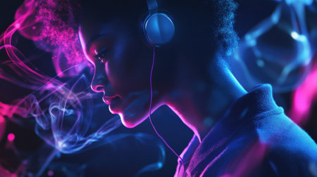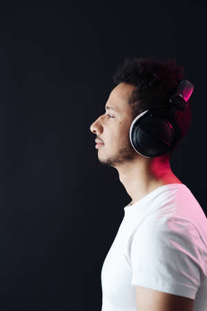 Smile Young African American man portrait wearing headphones and enjoy music over black Background with copy space. Red light reflection on face.