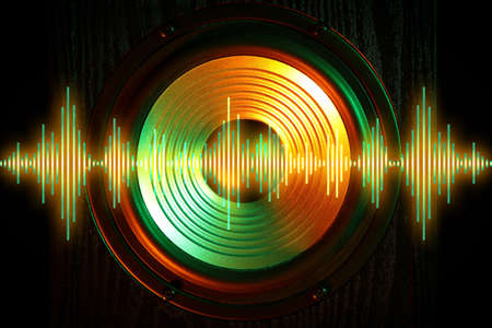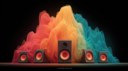 This image displays a set of audio speakers positioned in front of colorful, abstract sound wave formations. The composition features a dark backdrop, enhancing the vibrancy of the colors. The illustration may be used in various commercial applications, such as website design or advertising.