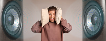 Annoyed man covering his ears with pillows from loud sound of speakers on beige grey background. Audio waves