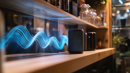 A sleek Bluetooth speaker rests on a wooden shelf, emitting stylish sound waves. The modern interior creates a cozy atmosphere for music enjoyment.